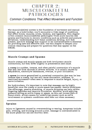This companion guide to the Musculoskeletal Pathologies video lesson is designed to help massage and bodywork students master the essential conditions they’ll need to recognize for the MBLEx. Inside, you'll find concise, focused summaries of the most commonly tested musculoskeletal disorders, including adhesive capsulitis (frozen shoulder), whiplash, scoliosis, lordosis, kyphosis, muscular dystrophy, gout, osteoarthritis, rheumatoid arthritis, sprains and strains, bursitis, tendonitis, spondylitis, spondylolisthesis, Osgood-Schlatter disease, and more. Each entry includes key symptoms, underlying causes or contributing factors, and important massage and bodywork considerations, so you can make safe, effective decisions in both clinical settings and exam scenarios. Whether you're reviewing for your licensing exam or reinforcing foundational knowledge, this guide will support your ability to think critically about pathology, scope of practice, and safe adaptations.