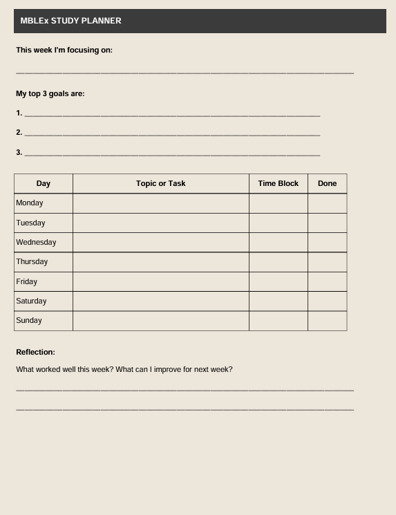 This printable MBLEx Study Planner helps you stay organized and on track with your prep. It breaks down what to study each day so you’re not overwhelmed, just focused. Use it to map out your time, check off your progress, and build steady momentum toward exam day.